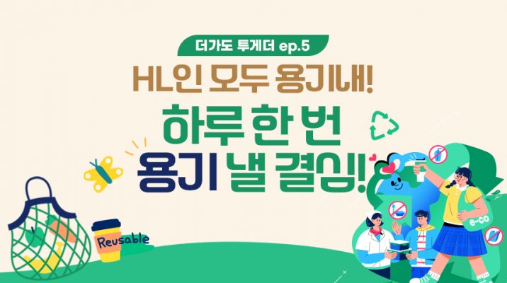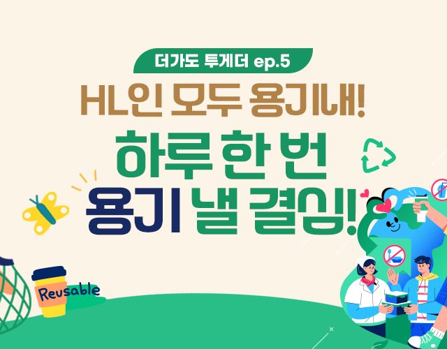 더가도 투게더 ep. 5 HL인 모두 용기 내! 하루에 한 번 ‘다회용기’ 사용하기 more> 택배, 배달 음식 등으로 우리의 생활은 정말 편리해졌죠! 반면에 잦은 일회용기 사용, 과대 포장으로 인한 환경 문제가 심각... 택배, 배달 음식 등으로 우리의 생활은 정말 편리해졌죠! 반면에 잦은 일회용기 사용, 과대 포장으로 ... 택배, 배달 음식 등으로 우리의 생활은 정말 편리해졌죠! 반면에 잦은 일...