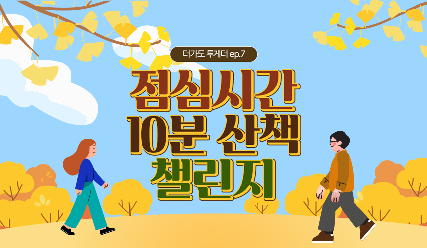 더가도 투게더 ep. 7점심시간 10분 산책 챌린지 more> 걷기 좋은 계절, 점심 먹고 걸으면서 업무 피로를 지우고, 오후 근무를 위한 에너지를 재충전해 보는 건 어떨까요? HL인들... 걷기 좋은 계절, 점심 먹고 걸으면서 업무 피로를 지우고, 오후 근무를 위한 에너지를 재충전해 보는 ... 걷기 좋은 계절, 점심 먹고 걸으면서 업무 피로를 지우고, 오후 근무를 ...