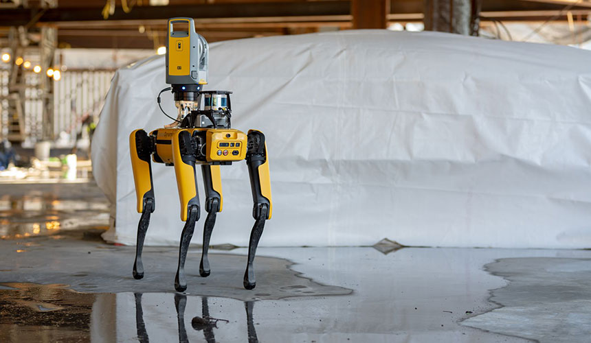 한라는 지난 11월 4일, 여러 건설사의 관심을 한몸에 받고 있는 사족보행 로봇 ‘스팟’의 현장 적용 실험을 진행했다. 미국 보스턴 다이내믹스가 개발한 스팟은 길이 110cm, 키 61cm(기본 보행 시), 체중 32kg으로, 머리에는 벨로라인의 라이다가, 등에는 트림블의 3D 스캐너(X7)가 장착됐다. 스팟은 경로 학습 후 자율보행하며 360도 지각 카메라로 지형과 장애물을 인식한다. 3D 스캐너는 주변 건물이나 물체의 고정밀 위치 정보를 취득한다. 최대 무게 14kg까지 스마트기기를 장착해 용도에 맞춰 쓸 수 있다. 이날 투입된 스팟은 국내에서 처음 선보인 고급 사양 ‘엔터프라이즈’ 모델로 자가 충전 기능과 충전용 독(Dock)을 갖춰 사람의 도움 없이 긴 시간 동안 검사와 데이터 수집 작업을 수행할 수 있다.