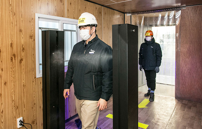 먼저 근로자 건강 관리를 위해 아침 TBM 시 방한복 착용 상태를 확인하고 음주 여부 확인 및 체온 측정을 실시하며 넥워머, 핫팩 등 방한용품을 지급한다. 정기적인 안전 보건 교육과 추가 교육을 실시할 때마다 주기적으로 혈압과 맥박을 확인하고 있다. 특히 고령자 및 혈압 이상자는 보건관리자와의 면담도 실시하도록 하며, 현장 점검 시 사탕을 지급하며 대화를 통해 근로자의 건강을 확인한다. 방역 수칙도 철저히 지키도록 한다. 전 근로자는 방역센터 안에서 소독을 실시한 후 현장 출입이 가능하다. 더불어 전 근로자와 관리자는 마스크를 착용해야 하며 2m 이상 간격을 확보하고, 매일 1회 이상 손소독 및 개인별 체온 측정을 실시하고 있다.