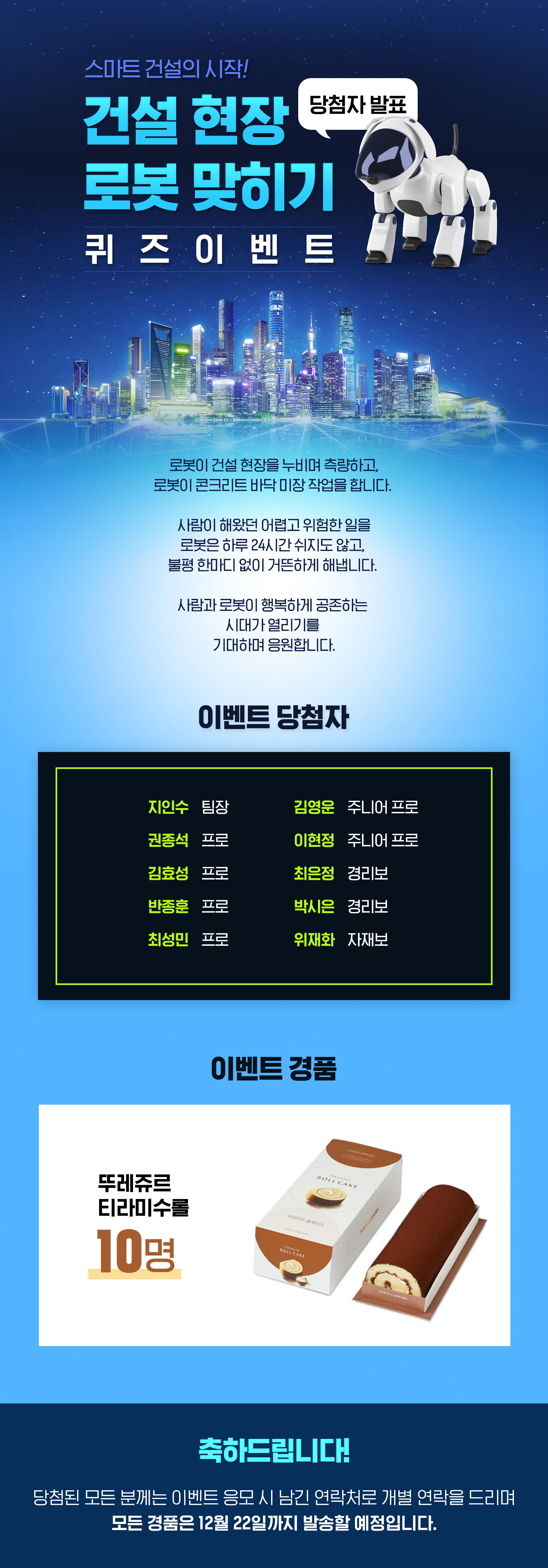 스마트 건설의 시작!건설 현장 로봇 맞히기 퀴즈 이벤트 당첨자 발표 공감1 등록된 댓글이 없습니다. 댓글 등록 Cancel reply 이름은 전체공개되며, 닉네임으로 설정 가능합니다. 이메일은 공개되지 않습니다. 이미지 업로드는 10 MB까지 가능합니다.