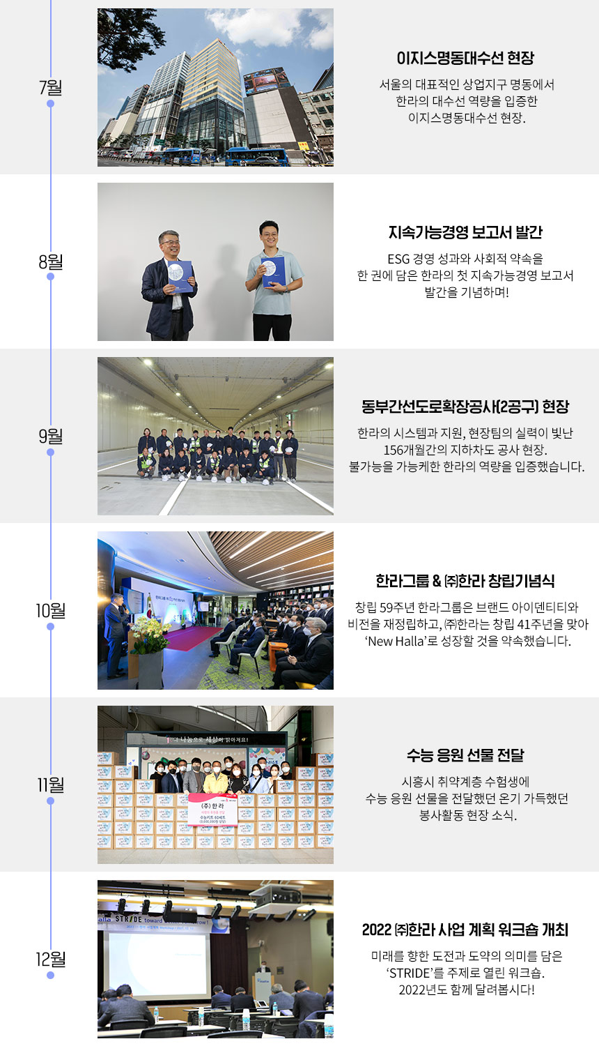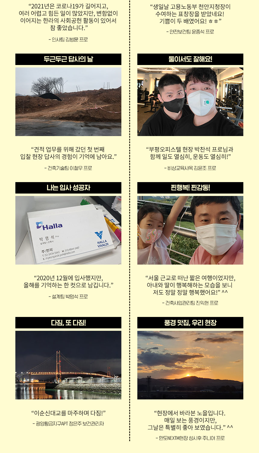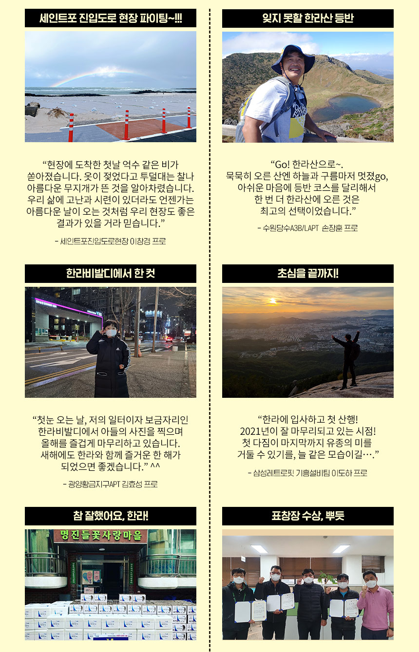 그날이 그날 같이 단조로워 보여도 사람들은 저마다 1년 365일 크고 작은 일을 만나고, 울고 웃으며 살아갑니다. 되돌아보면 하루, 한 시간 소중하지 않은 때가 없는 법. 한라와 한라인에게 2021년은 어떤 의미일까요? 다시 돌아오지 않을 2021년의 희로애락을 한 장의 사진으로 만나봅니다.