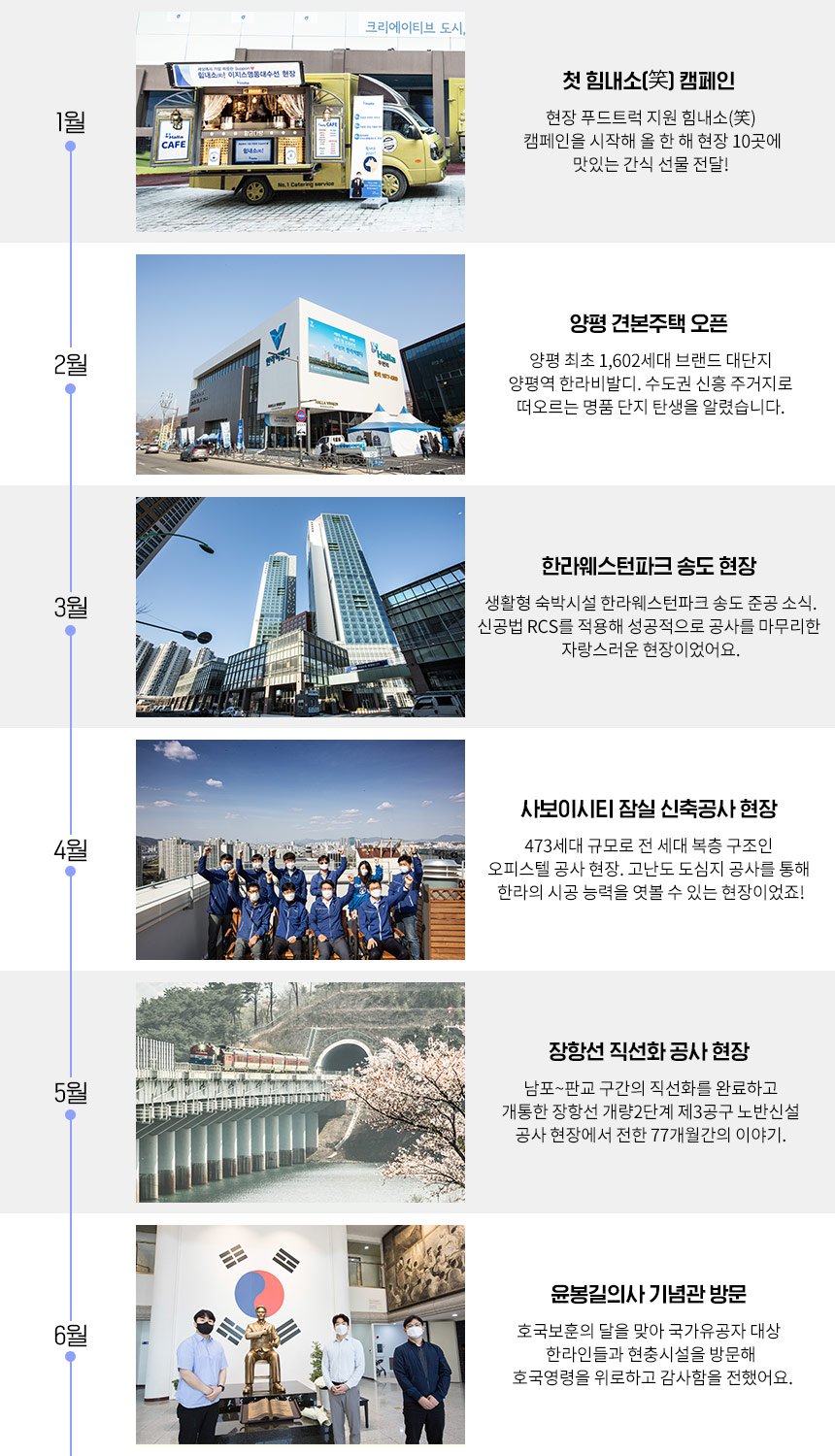 올 한해 웹진 ‘The Four Seasons’에서는 무슨 일이 있었을까요? 먼저, 전국 각지 13곳의 한라 공사 현장과 견본주택 4곳을 방문해 각자의 자리에서 최선을 다하는 한라인들을 만났습니다. 또, 코로나19로 어려움이 많은 시기에 집에서 가족과 함께 즐길 수 있는 비대면 클래스를 7차례 진행하며 즐거운 체험을, 한라마켓을 통해 6팀의 한라인 가족에게 행복한 추억을 선물했습니다. 2021년 만난 한라인의 땀과 웃음은 총 22번의 뉴스레터로 발송됐고, 웹진은 누적 조회 수 90,789회(11월 말 기준)를 기록했습니다. 그럼 웹진 콘텐츠를 통해 올 한해를 함께 되돌아볼까요?