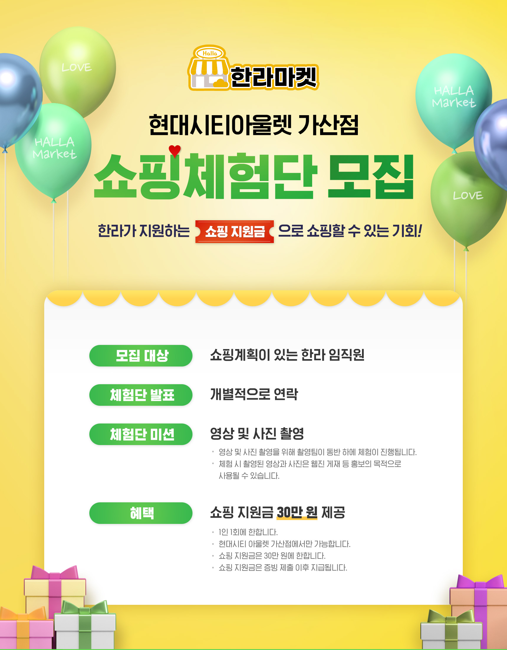 현대시티아울렛 가산점쇼핑 체험단 모집 1. 한라마켓 쇼핑지원금으로 무엇을 구매하실 계획인가요? 이전 다음 2. 한라마켓 쇼핑을 누구와 함께하실 건가요? 이전 다음 3. 본 콘텐츠는 영상 촬영이 동반되며 한라 SNS 채널에 활용될 수 있습니다. 이에 동의하시나요?(네/아니오) 이전 다음 감사합니다 틀린 답이 있네요.정답을 모두 맞춰야 이벤트 응모가 가능합니다.다시 한번 풀어보세요. 이름 전자우편 휴대전화 응모하기 개인정보 수집에 동의합니다. 개인정보는 이벤트 당첨자 확인 및 배송 정보 등으로만 사용되며 본 이벤트 외에 다른 용도로 사용되지 않습니다. [이벤트 서비스를 위한 개인정보 수집 및 이용] 서비스 제공을 위하여 이용자의 개인정보를 아래와 같이 수집하고 있습니다. 고객의 정보는 이벤트 서비스에 참여하기 위한 필수정보로서 제공을 원하지 않을 경우 수집하지 않으며, 동의 거부 시 이벤트 참여에 제한을 받을 수 있습니다. 1. 수집 · 이용 목적 - 이벤트 혜택을 제공하기 위한 정보 전달 - 이벤트 혜택 이용에 따른 본인확인, 고지사항 전달 - 접속 빈도 파악 또는 회원의 서비스 이용에 대한 통계 2. 수집 필수 항목 - 이름, 연락처, 이메일 3. 개인정보 보유 및 이용기간 - 이벤트 종료 후 1년까지 (단, 관계 법령에 따라 필요한 경우 해당 법률에서 정한 기간까지) 4. 이용 제한 대상 - 만 14세 미만은 법적 보호자의 동의가 필요합니다. ※ 고객님께서 개인정보의 수집/이용에 동의하지 않을 권리가 있으며, 미동의 시 서비스를 이용하실 수 없습니다. 다시하기 공감1 등록된 댓글이 없습니다. 댓글 등록 Cancel reply 이름은 전체공개되며, 닉네임으로 설정 가능합니다. 이메일은 공개되지 않습니다. 이미지 업로드는 10 MB까지 가능합니다.