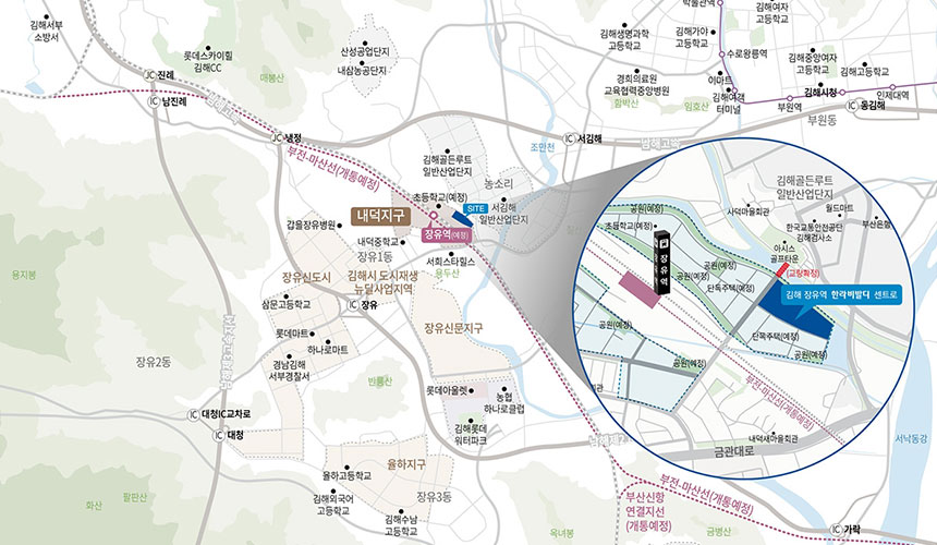 김해시는 매년 인구 유입이 증가하고 있으며, 부동산 비규제지역으로 부산의 집값 상승으로 대체 주거지를 찾는 인구도 많아 앞으로가 기대된다. 특히 장유는 도시재생뉴딜사업 및 부울경 메가시티계획과 신문지구 개발 등 미래 가치가 풍부한 곳이다.