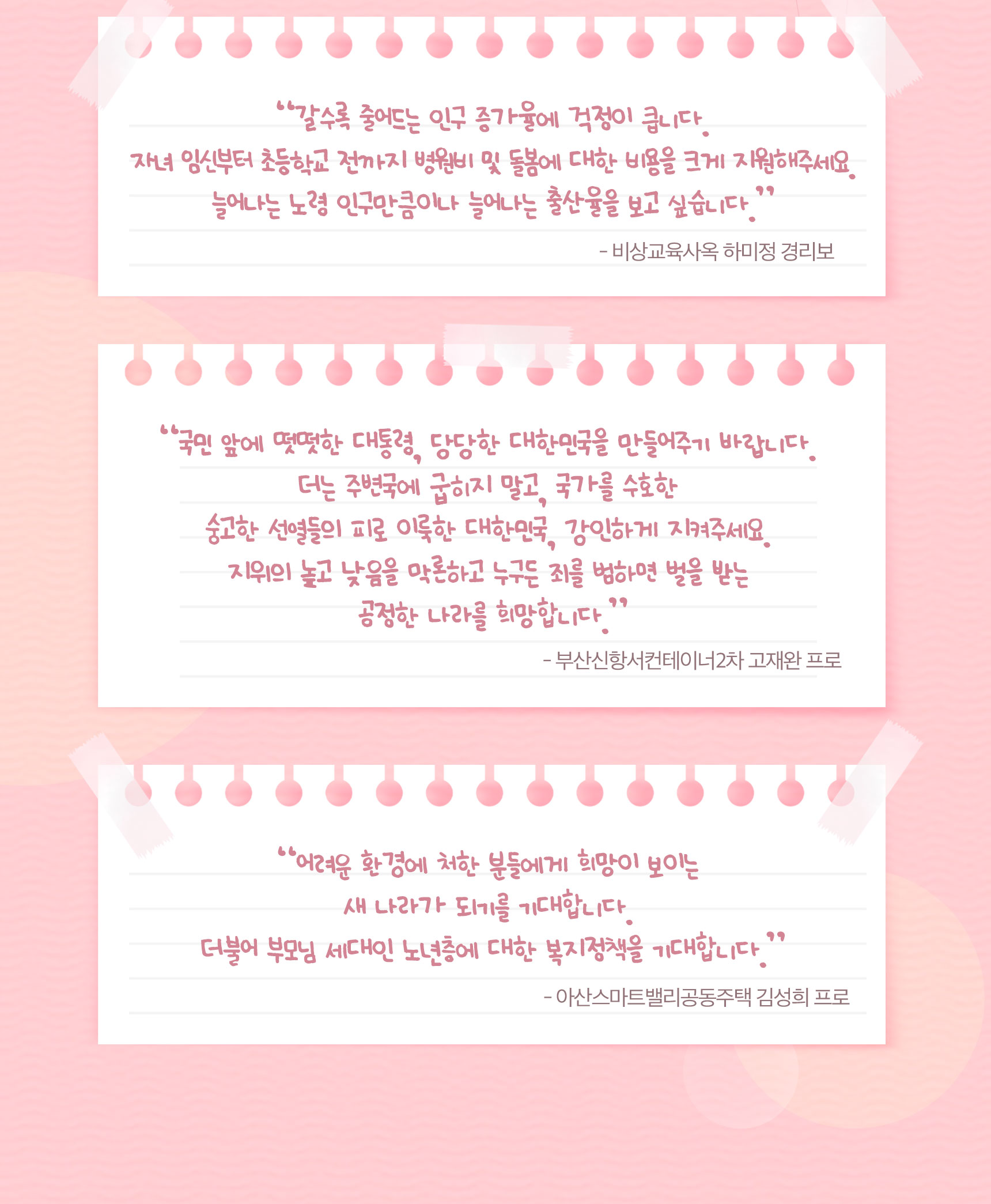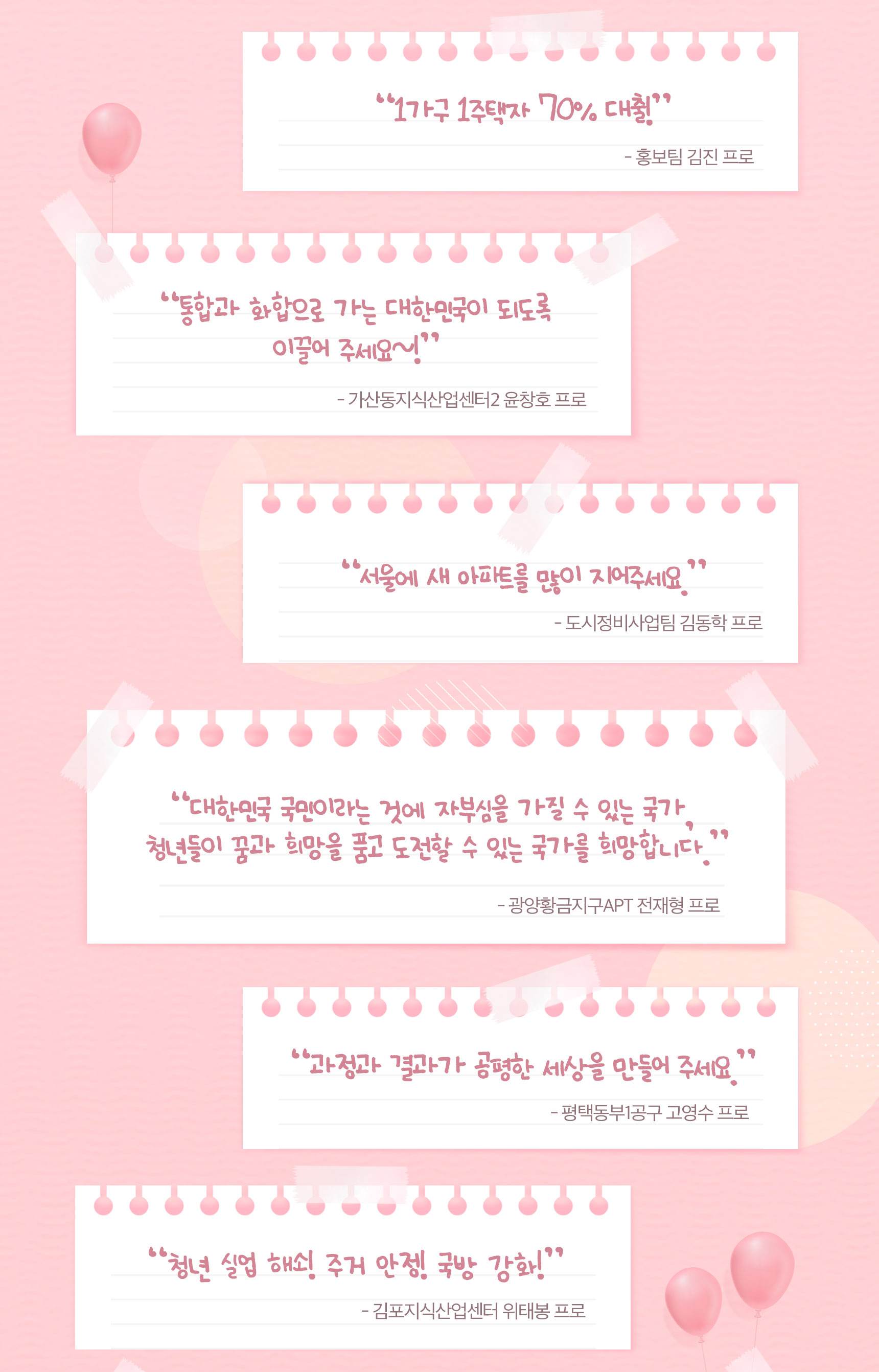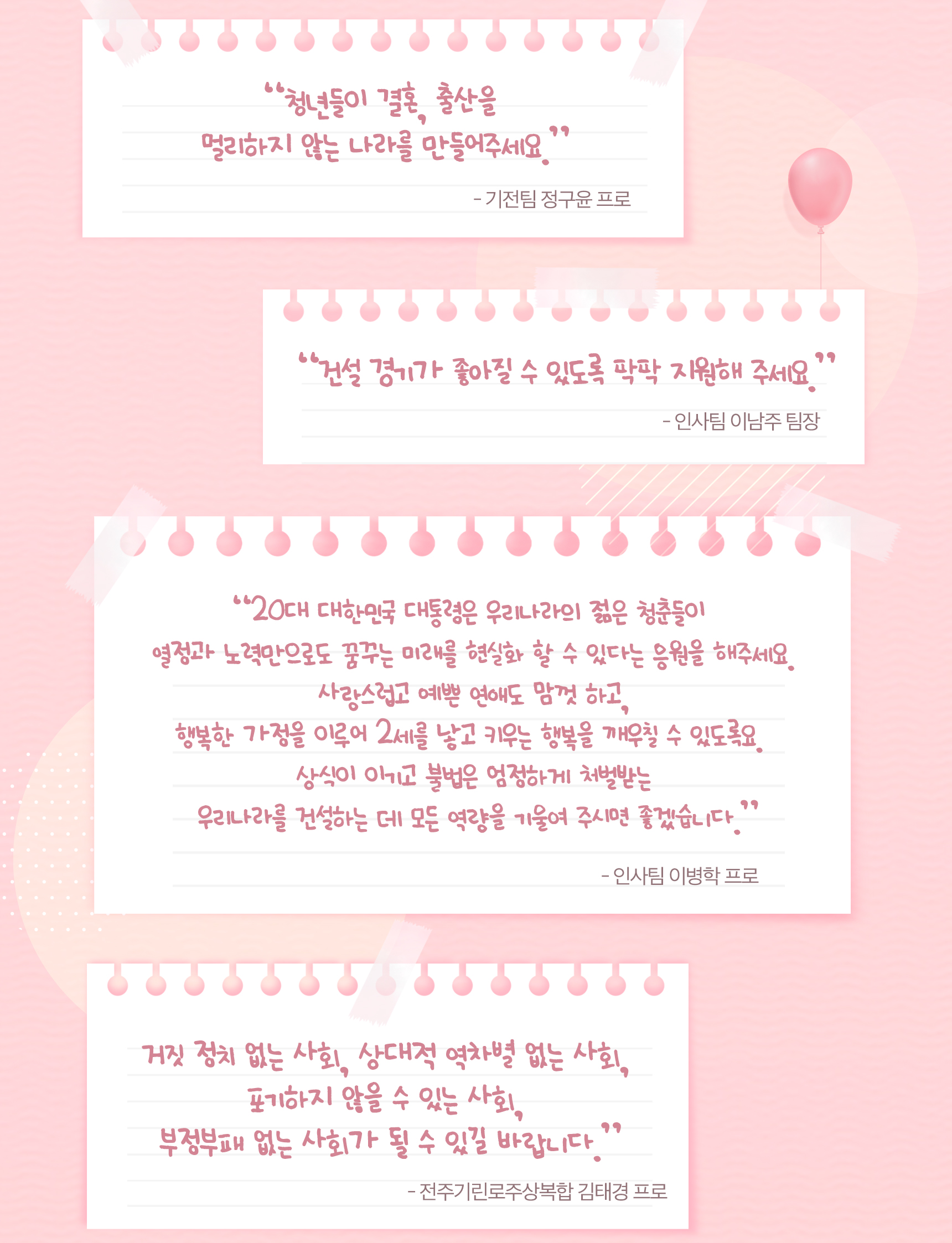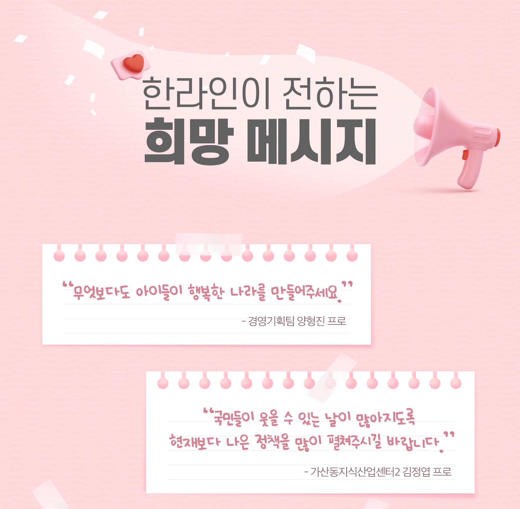 보다 나은 미래를 위해!새 대통령, 우리나라에 바란다 대한민국 제20대 대통령이 선출됐다. 우리나라가 국제사회로부터 선진국으로 인정받은 뒤 처음 치러진 선거인 만큼 앞으로 펼쳐질 미래를 향한 온 국민의 기대가 크다. 대전환의 시대를 시작하며 새 대통령에 바라는 한라인의 희망 메시지를 모았다. * 본 설문은 한라 임직원을 대상으로 2022년 3월 4일부터 7일까지 진행됐습니다. 글 편집부 공감2 등록된 댓글이 없습니다. 댓글 등록 Cancel reply 이름은 전체공개되며, 닉네임으로 설정 가능합니다. 이메일은 공개되지 않습니다. 이미지 업로드는 10 MB까지 가능합니다.