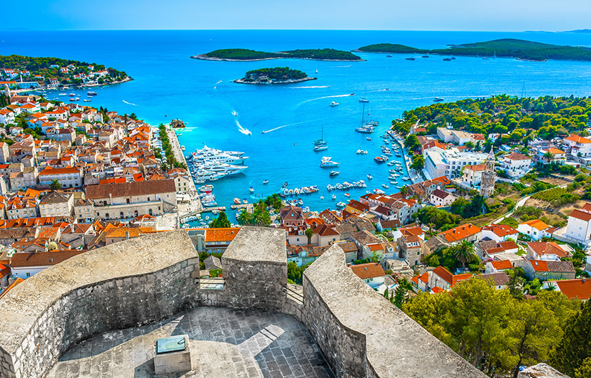마을과 지중해에 떠 있는 군도가 연출하는 크로아티아 바닷가 마을의 멋진 전망.