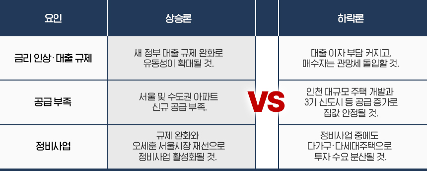 먼저 상승론의 근거를 살펴보자. 상반기 거래 건수가 줄었다는 게 가격 하락을 의미하는 것은 아니라는 점. 또한 서울 강동구 둔촌주공 등 대규모 신규 공급이 막혀 있어 입주 물량이 감소한다는 점을 근거로 들었다. 과세기준일인 6월 1일이 지나면서 다주택자들이 집을 급하게 처분할 이유가 없다는 점에서도 하반기 집값 상승을 기대한다는 의견이 있었다. 오세훈 시장 당선으로 그동안 억눌렸던 정비사업이 속도를 낼 경우 서울 주택 시장에 호재로 작용해 집값을 올리는 요인이 된다는 전망도 더해졌다.