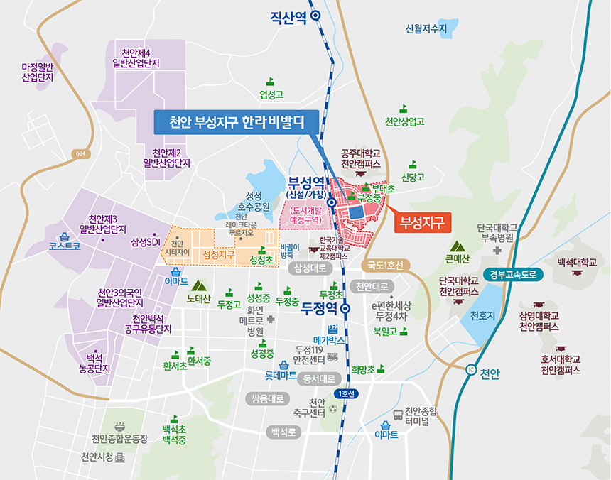 교육 환경도 탄탄하다. 부대초, 부성중, 신당고, 공주대, 한국기술교육대 제2캠퍼스 등이 인근에 있으며, 단지 내 국공립 어린이집 신설이 예정되어 있다. 또한 삼성SDI, 천안산업단지, 백석농공단지 등 직주근접의 효과가 크고, 대형 마트와 영화관 등 생활 인프라가 풍부하다.