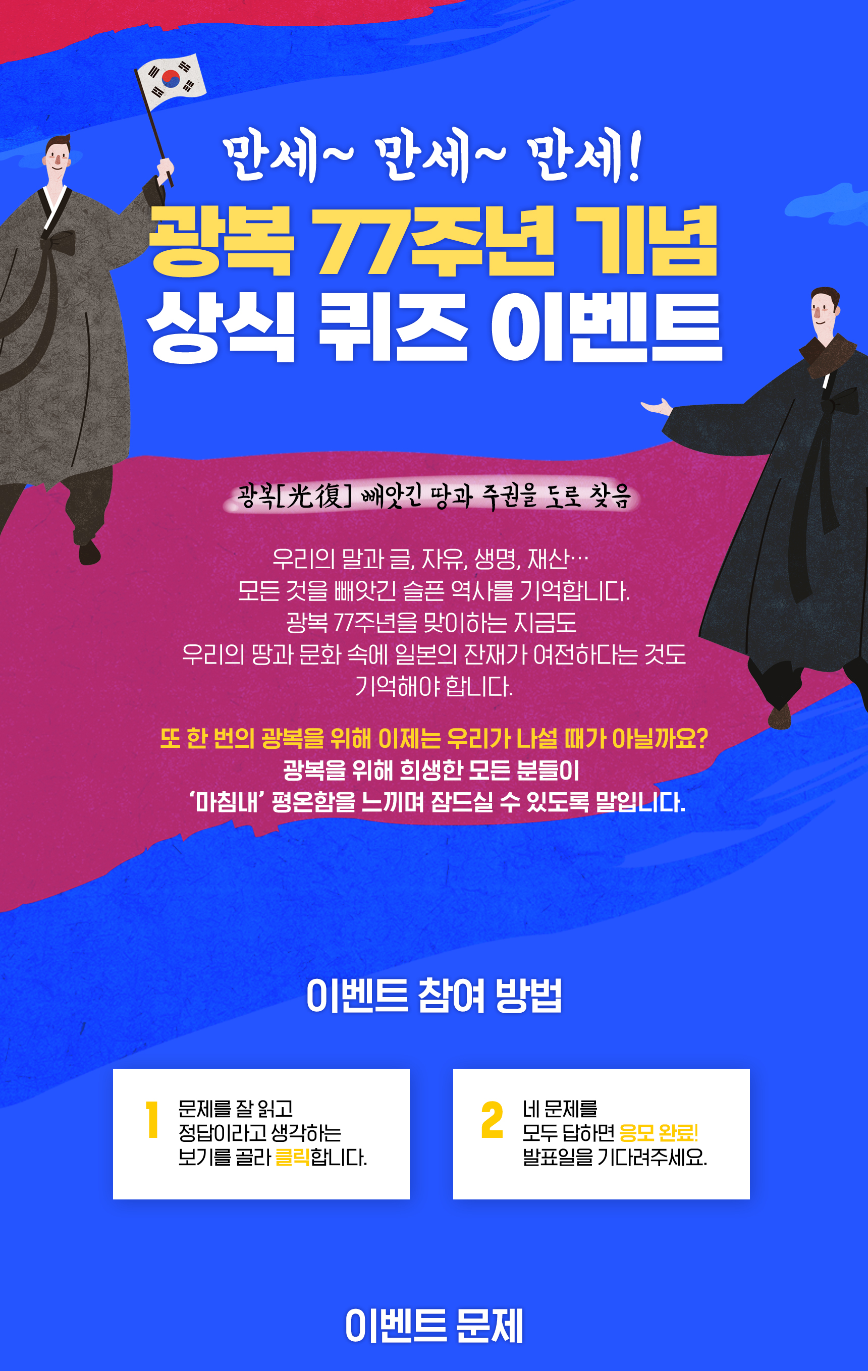 만세~ 만세~ 만세!광복 77주년 기념 상식 퀴즈 이벤트 문제 1. 우리나라 광복 연도는?. 1943년 1945년 1948년 다음 문제 2. 중국 홍커우 공원에서 의거한 독립운동가는? 윤봉길 의사 안중근 의사 박열 의사 다음 문제 3. 대한민국임시정부가 있던 도시는? 러시아 연해주 중국 상하이 일본 도쿄 다음 문제 4. 우리나라 5대 국경일이 아닌 것은? 광복절 식목일 한글날 다음 참여완료 틀린 답이 있네요.정답을 모두 맞춰야 이벤트 응모가 가능합니다.다시 한번 풀어보세요. 이름 전자우편 휴대전화 응모하기 개인정보 수집에 동의합니다. 개인정보는 이벤트 당첨자 확인 및 배송 정보 등으로만 사용되며 본 이벤트 외에 다른 용도로 사용되지 않습니다. [이벤트 서비스를 위한 개인정보 수집 및 이용] 서비스 제공을 위하여 이용자의 개인정보를 아래와 같이 수집하고 있습니다. 고객의 정보는 이벤트 서비스에 참여하기 위한 필수정보로서 제공을 원하지 않을 경우 수집하지 않으며, 동의 거부 시 이벤트 참여에 제한을 받을 수 있습니다. 1. 수집 · 이용 목적 - 이벤트 혜택을 제공하기 위한 정보 전달 - 이벤트 혜택 이용에 따른 본인확인, 고지사항 전달 - 접속 빈도 파악 또는 회원의 서비스 이용에 대한 통계 2. 수집 필수 항목 - 이름, 연락처, 이메일 3. 개인정보 보유 및 이용기간 - 이벤트 종료 후 1년까지 (단, 관계 법령에 따라 필요한 경우 해당 법률에서 정한 기간까지) 4. 이용 제한 대상 - 만 14세 미만은 법적 보호자의 동의가 필요합니다. ※ 고객님께서 개인정보의 수집/이용에 동의하지 않을 권리가 있으며, 미동의 시 서비스를 이용하실 수 없습니다. 다시하기 × 공감3 1 Comment 좋은퀴즈였어요 ~ 잘 몰랐던 것도 이번 기회에 알게되었어요!! 댓글 등록 Cancel reply 이름은 전체공개되며, 닉네임으로 설정 가능합니다. 이메일은 공개되지 않습니다. 이미지 업로드는 10 MB까지 가능합니다.