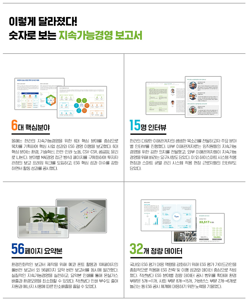보고서 내용 중 ESG 경영 전략 및 추진 체계 부분과 각 부문의 ESG Highlights 페이지는 반드시 주목해야 할 부분이다. 더욱 나은 내일로 나아가기 위한 한라만의 ESG 경영 전략과 체계를 한눈에 볼 수 있다. 또한 ESG 경영 10대 추진 전략과 연계해 지속가능경영 성과를 매핑해 공시해 두었다. ESG Highlights는 핵심 분야별 ESG 성과를 일러스트와 수치로 표현해 가독성을 높였다.