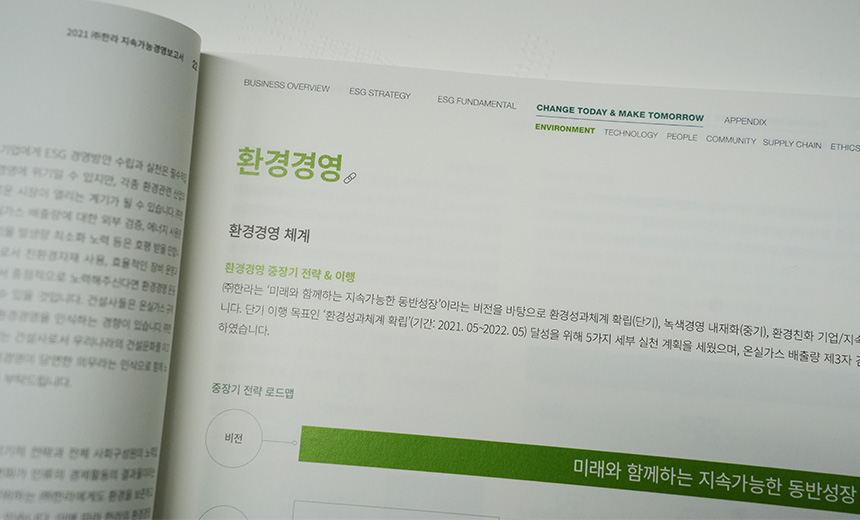 지난 한 해 한라의 지속가능경영 성과와 비전을 집약한 ‘2021 지속가능경영 보고서’가 발간됐다. 지속가능경영을 위한 6대 핵심 분야를 중심으로 ESG 경영 성과를 발표한 이번 보고서는 이해관계자와의 소통을 위한 풍성한 데이터와 가독성을 높인 디자인, 친환경적인 제작 과정이 더해져 한층 더 완성도를 높였다. 2021 지속가능경영 보고서에 어떤 내용이 담겨 있는지 페이지를 넘겨본다.