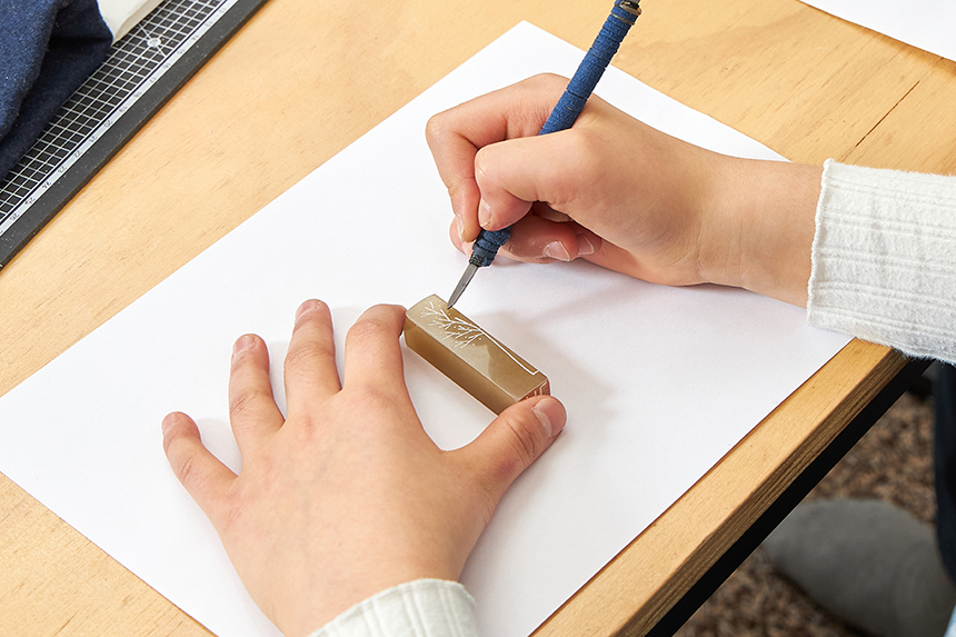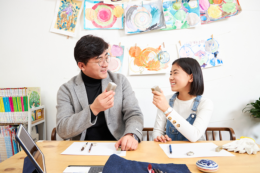 딸 처음에는 도장 새기는 칼이 날카롭고 딱딱해 보여서 조금 무서웠어요. 만들다 보니 글씨가 새겨지는 게 신기하고 재미있었어요.