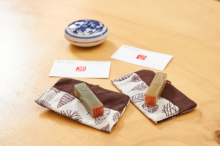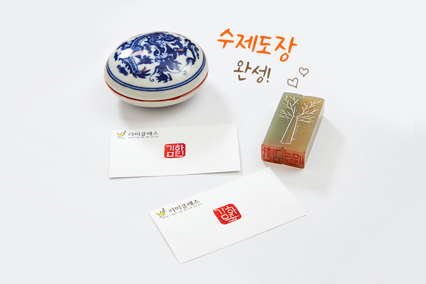 도장이 완성되면 인주를 세게 누르지 말고 여러 번 톡톡 두드려 묻힌 다음 종이에 찍어 확인한다. 그 위에 엠보싱파우더를 뿌리고 살짝 열을 가하면 볼륨과 광택이 생겨 더욱더 고급스러워진다.