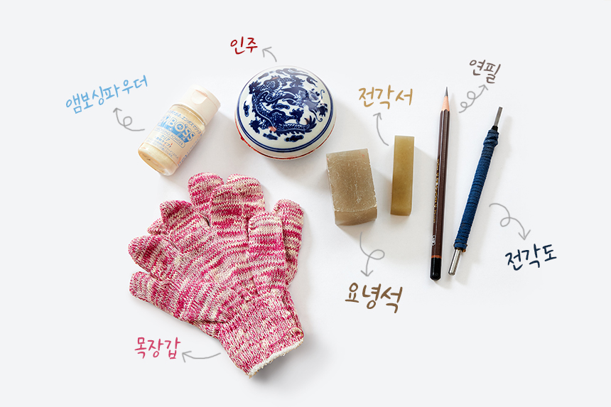 연필, 지우개, 요녕석(연습용 돌), 전각서, 전각도, 인주, 앰보싱파우더, 목장갑, 종이, 사포