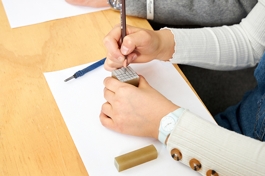 요녕석에 연필로 가로선과 세로선을 그리고 전각도로 파는 연습을 한다. 그다음 사포로 요녕석 표면을 갈아내어 평편하게 다듬은 후 동그라미를 그리고 요녕석을 돌리면서 파내는 연습을 한다.