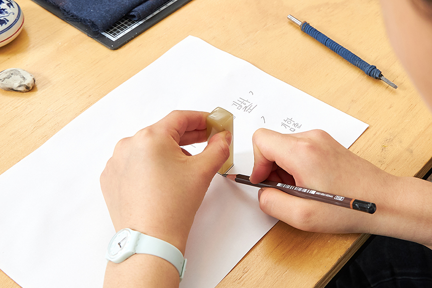 도장을 찍을 때 엄지와 검지가 닿는 측간 부분에 원하는 모양대로 도안을 그린 다음 전각도로 파낸다.