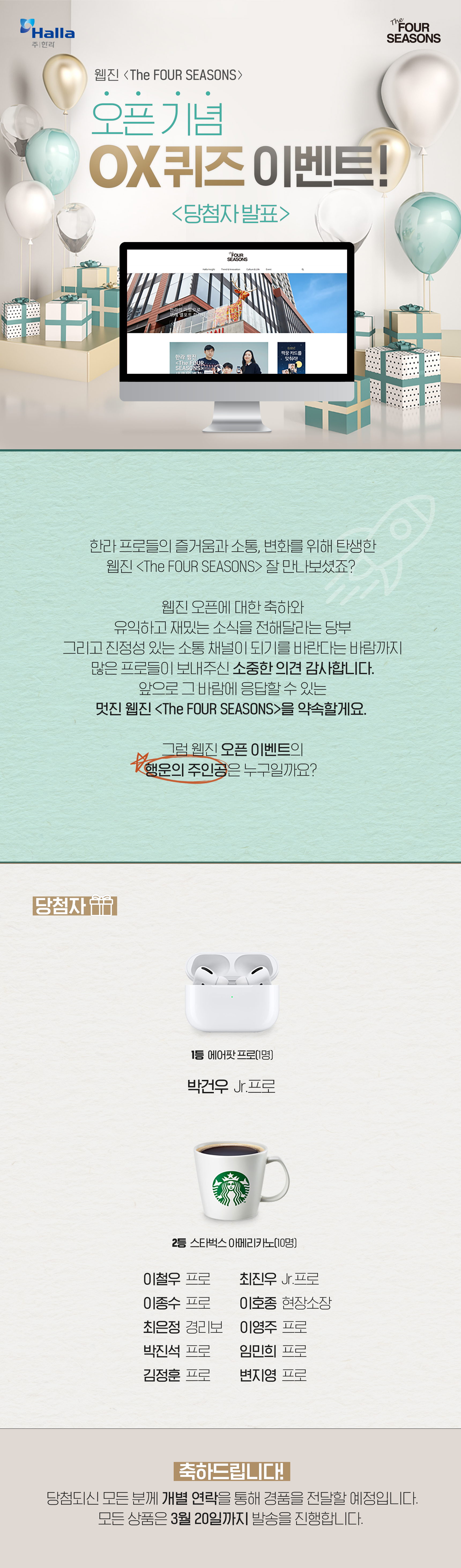 웹진 <The FOUR SEASONS>오픈 기념 OX퀴즈 이벤트 당첨자 발표 공감3 1 Comment 우와 축하드려요!!! 댓글 등록 Cancel reply 이름은 전체공개되며, 닉네임으로 설정 가능합니다. 이메일은 공개되지 않습니다. 이미지 업로드는 10 MB까지 가능합니다.