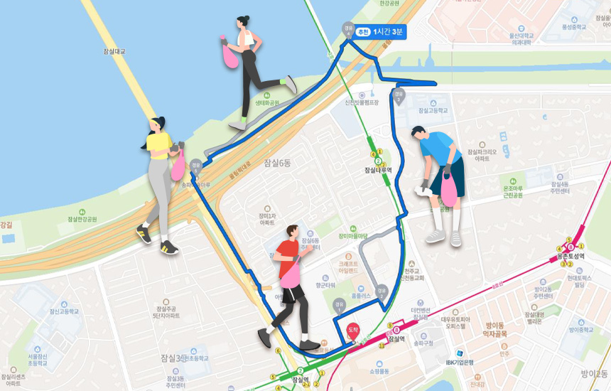 만반의 준비를 마친 임직원들이 삼삼오오 출발했다. 줍깅 챌린지는 본사 앞에서 출발해 잠실역 공영주차장, 한신코아 아파트 뒷길, 잠현초등학교, 잠실 한강 공원을 지나 회사로 돌아오는 1시간 30분여의 코스로 진행됐다. 임직원들은 가로수 아래 담배꽁초, 바닥에 뒹구는 페트병 등 하나라도 놓칠세라 길가 구석구석을 살펴보았다.