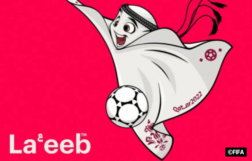 라이브(La’eeb)라는 이름을 가진 마스코트는 평행우주(역대 월드컵 마스코트들이 사는 마스코트 버스)에서 찾아왔다. 가오리나 영화 주인공인 꼬마 유령 캐스퍼를 닮은 귀여운 모습으로, 아랍의 머리 장식을 하고 있다. 눈썰미가 있는 사람이라면 마스코트에 발이 없다는 점을 눈치챘을 터. 공을 발로 차는 축구 대회에 발이 없는 마스코트가 등장하는 역설적인 콘셉트가 재미있다.