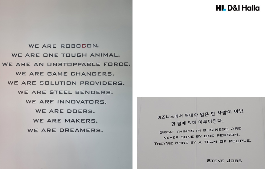 A. 보수적인 분야의 사업을 하고 있지만, 평균 연령대가 30대 중후반으로 젊고, 팀 베이스로 움직여야 하는 조직인 만큼 생산과 제조 라인을 포함해서 계속 벤처와 같은 분위기를 유지하고 싶어요. 로보콘의 구성원들이 염두에 두면 좋은 글귀를 사무실과 당진 공장에 적어두고 구성원들이 늘 접할 수 있게 하고 있습니다.