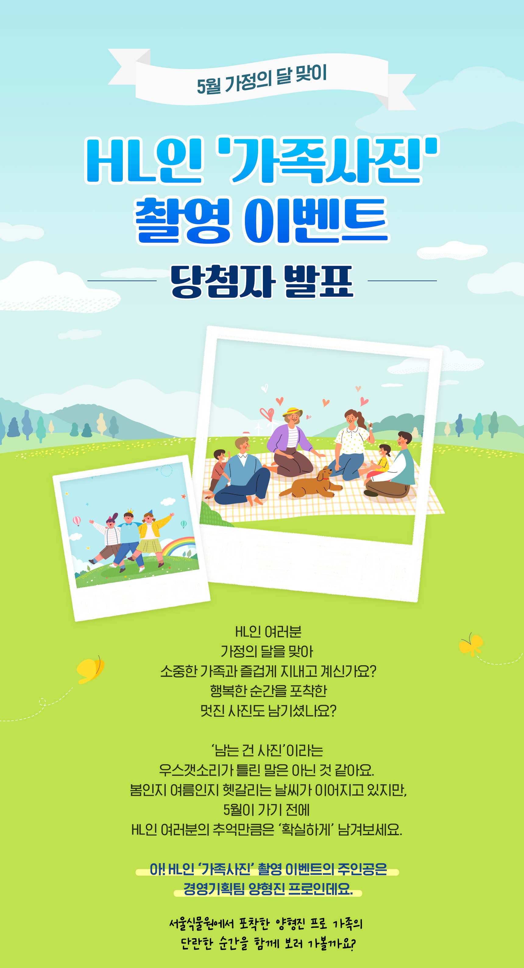 5월 가정의 달 맞이 HL인 ‘가족사진’ 촬영 이벤트 당첨자 발표 공감0 등록된 댓글이 없습니다. 댓글 등록 Cancel reply 이름은 전체공개되며, 닉네임으로 설정 가능합니다. 이메일은 공개되지 않습니다. 이미지 업로드는 10 MB까지 가능합니다.