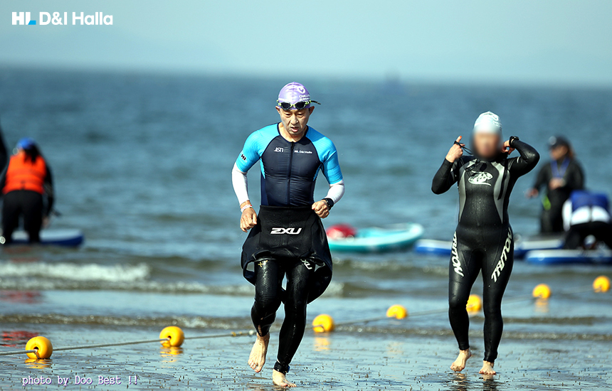 이번 대회에서 완주의 승패를 가른 종목은 수영이었습니다. 군산 바다의 파도와 너울이 그 정도로 높고 거칠지 몰랐어요. 대회 전 여러 차례 경기가 치러질 바다를 다녀왔는데 해변에서 떨어진 먼바다쪽 파도가 만만치 않았습니다. ‘수영 훈련을 충분히 하지 못했는데 3.8km를 완주할 수 있을까?’ 걱정이 앞섰어요. 다행히 대회 당일 평소보다 파도가 잠잠해졌어요. 그리고 서해 조수간만의 차이로 수영 거리가 짧아질 거라고 하더군요. 1.9km를 갔다가 돌아올 때는 물이 상당히 빠지기 때문에요. 다른 대회보다 200m 정도 수영을 덜 한 것 같았고, 심리적으로도 도움이 됐어요.