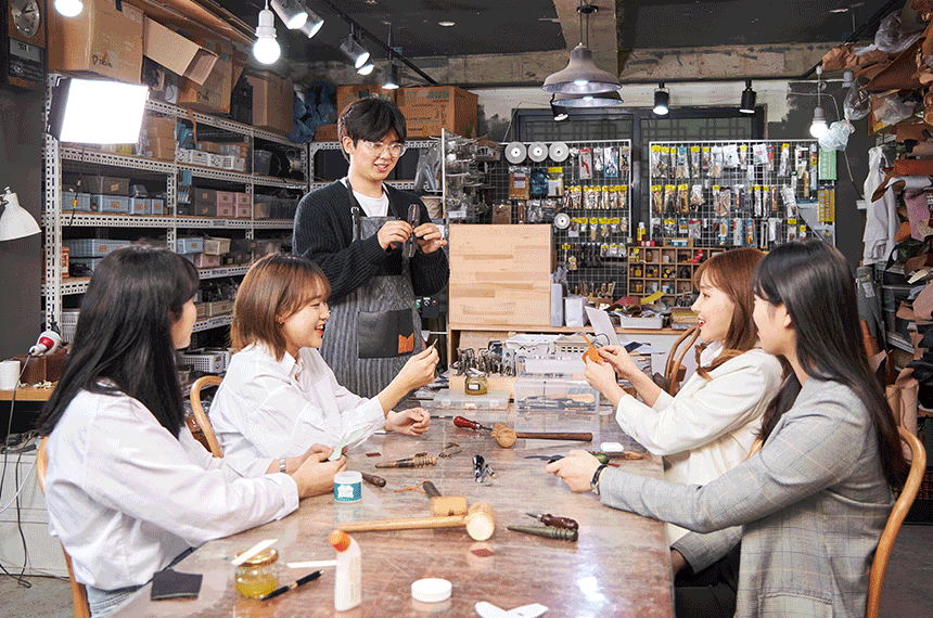 가죽으로 에어팟 케이스 만들기에 도전한 4인방은 가죽 고르기부터 이니셜 각인까지 저마다의 개성을 담아 세상 하나뿐인 작품을 완성했다. 일상의 활력을 충전하는 값진 힐링 타임이었다. 시종일관 웃음이 끊이지 않았던 그날, 4인방의 마음에는 뿌듯함과 추억 하나가 새겨졌다.