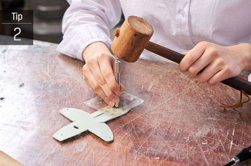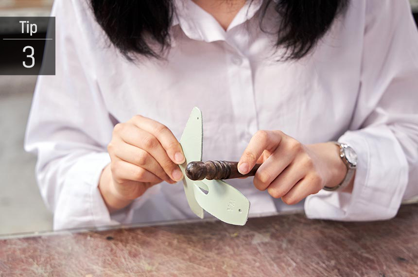 가죽 두께에 맞는 헤리 오토시를 이용해 지저분한 가죽 절단면을 위로 밀어 올리며 깔끔하게 자르는 과정(사진 1)이 필요하다. 이니셜을 새길 때는 각인 기계를 이용할 수도 있지만, 이니셜 수지판을 대고 망치로 두드리는 수작업(사진 2)도 가능하다. 마감 단계에서 가죽 절단면에 CMC를 바르고 마를 때까지 우드 슬리커로 살살 문지른다(사진 3). 가죽에 광택을 내는 과정이다.
