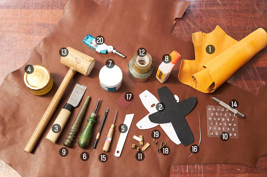 1.크롬 가죽 2.도안 3.칼 4.본드 5.본드 주걱 6.에지 베벨러(헤리 오토시) 7.CMC(가루형 마감재) 8.에지 코트 9.우드 슬리커 10.이니셜 수지판 11.이니셜 각인 스탬프 12.금박은〮박 테이프 13.망치 14.아일렛 공구 15.송곳 16.실,바늘 17.사포 18.키링(개고리) 19.솔트레지 20.라이터