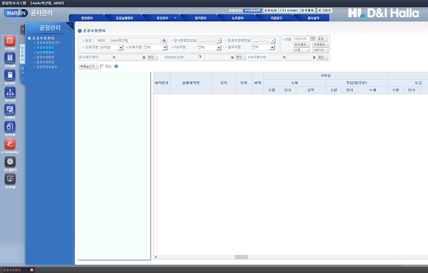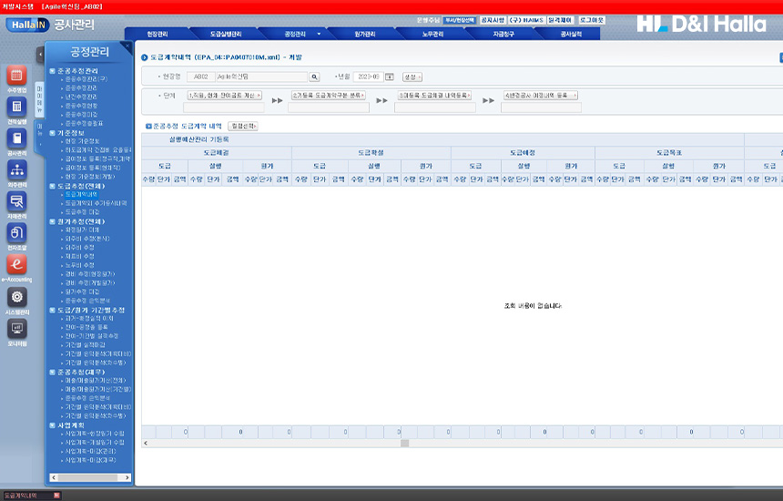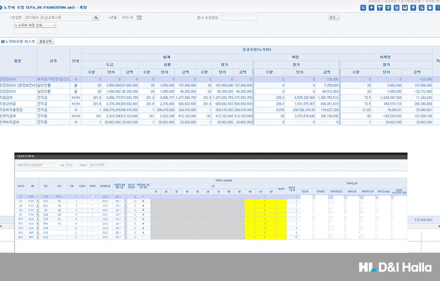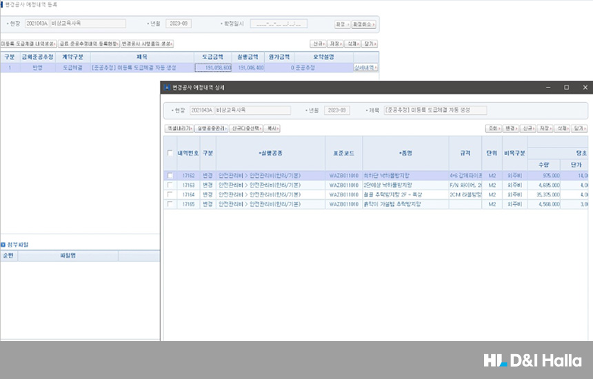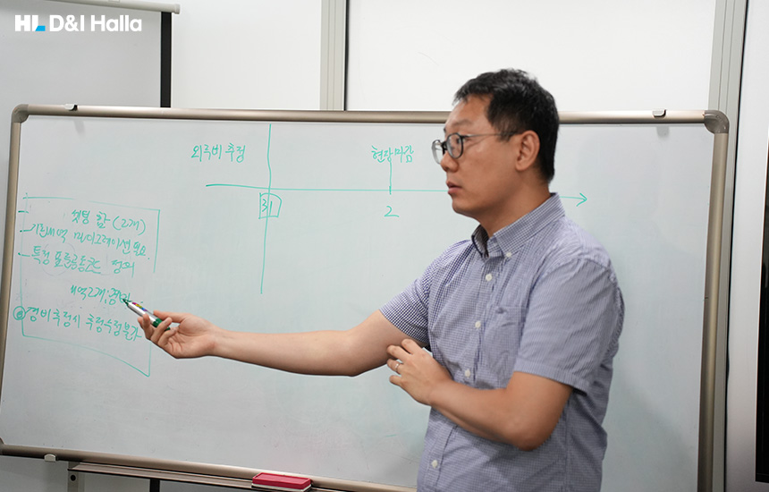 그다음 ‘작성 방식과 기준’이 불편해 개선할 여지가 많았습니다. 업무 시스템인 HallaIN에 준공 추정 시스템이 구현되어 있지만, 현장에서는 대부분 엑셀 프로그램을 이용한 수작업으로 준공 추정 업무를 진행하고 있어서 신속 정확한 결과 도출에 어려움이 있었습니다. 또한 현장별로 동일한 내역의 원가를 추정하면서 상이한 결과를 도출하여 신뢰도를 저하하는 것도 문제였습니다.
