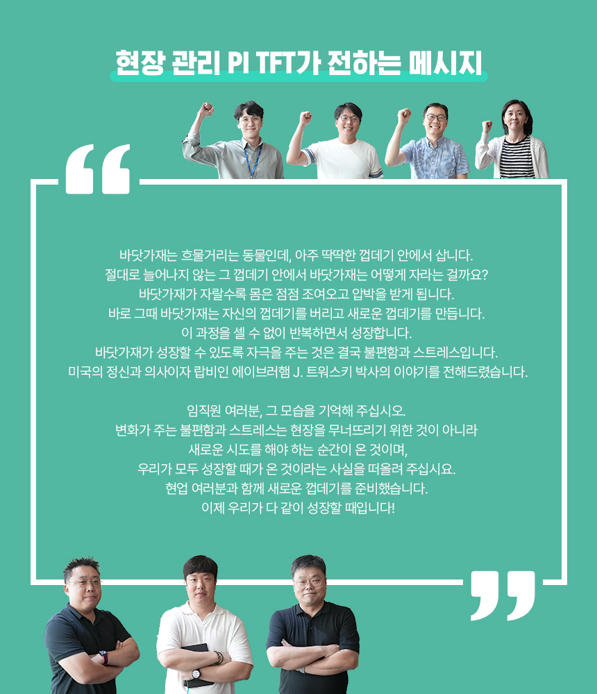 무엇보다 ‘열린 마음’이라고 생각합니다. 개선 대상이라고 여기는 기존의 프로세스도 과거에 오랜 고심 끝에 만들어 낸 결과물입니다. 단지 현재 여건상 최선의 방법이 아닌 것뿐입니다. 대내외 환경이 변화하면 그에 맞도록 프로세스를 개선하고 시스템에 녹이며 현업에서 사용해야 하는 것이죠. 하지만 바쁜 업무의 홍수 속에 휩쓸리다 보면 이러한 변화가 임직원 여러분에게 달갑지 않은 것이 인지상정입니다. 익숙하지 않은 새로운 프로세스와 달라진 업무 범위에 대해 ‘열린 마음’을 갖고 적극적인 개선 의지와 도입 의지를 발현해 주시면 우리 일터를 한 걸음 더 발전시키는 원동력이 되리라 생각합니다.
