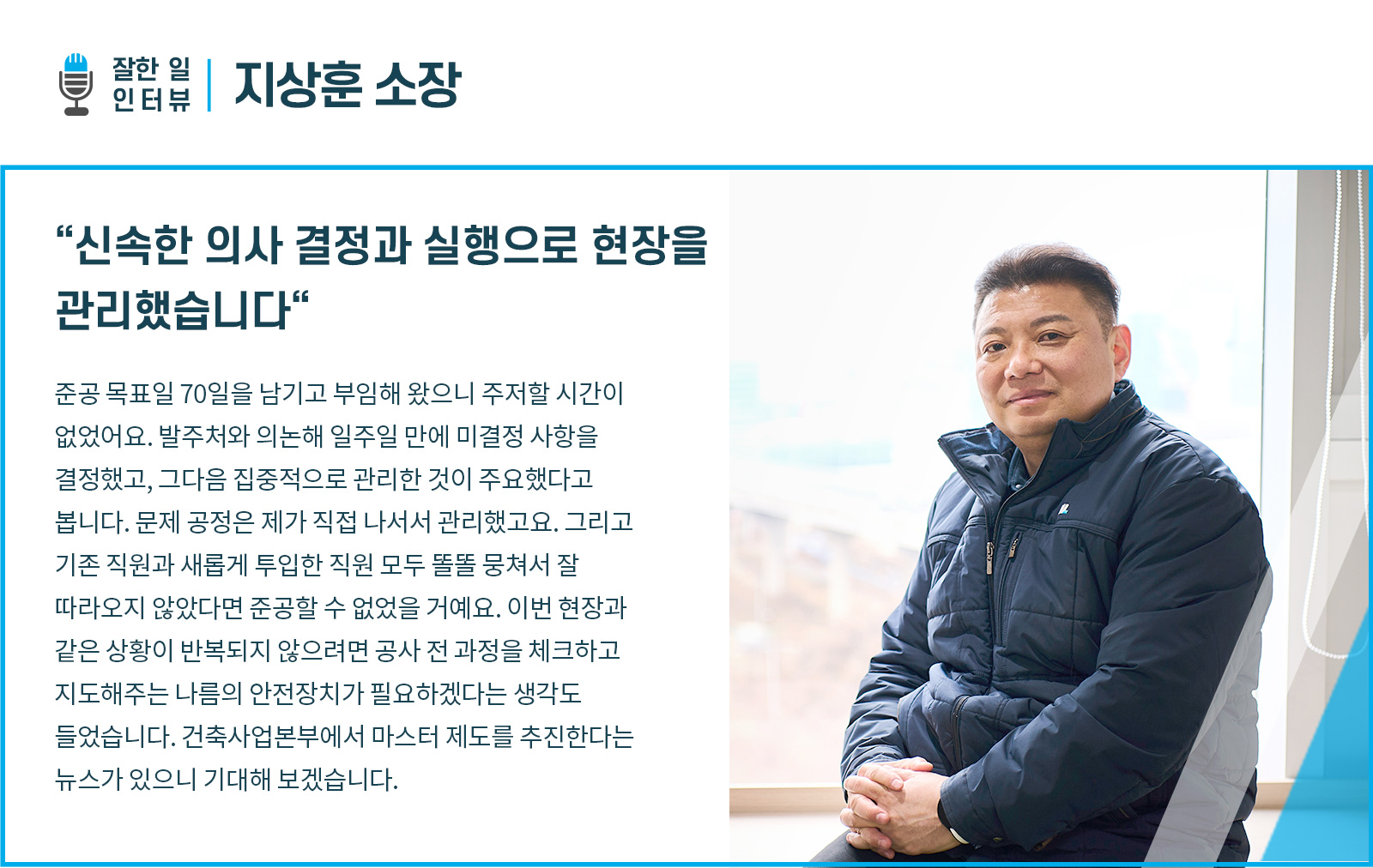 지상훈 소장의 말대로 ‘정신없이 일을 밀어붙인’ 현장은 기적과도 같은 준공 목표를 달성하며, 발주처에 약속을 지키는 당사의 이미지를 각인시켰다. 유난히 고된 현장이었다고 입을 모은 지상훈 소장과 팀원들이 이어갈 다음 여정에는 따뜻하고 부드러운 봄바람만 불어오기를 바란다.