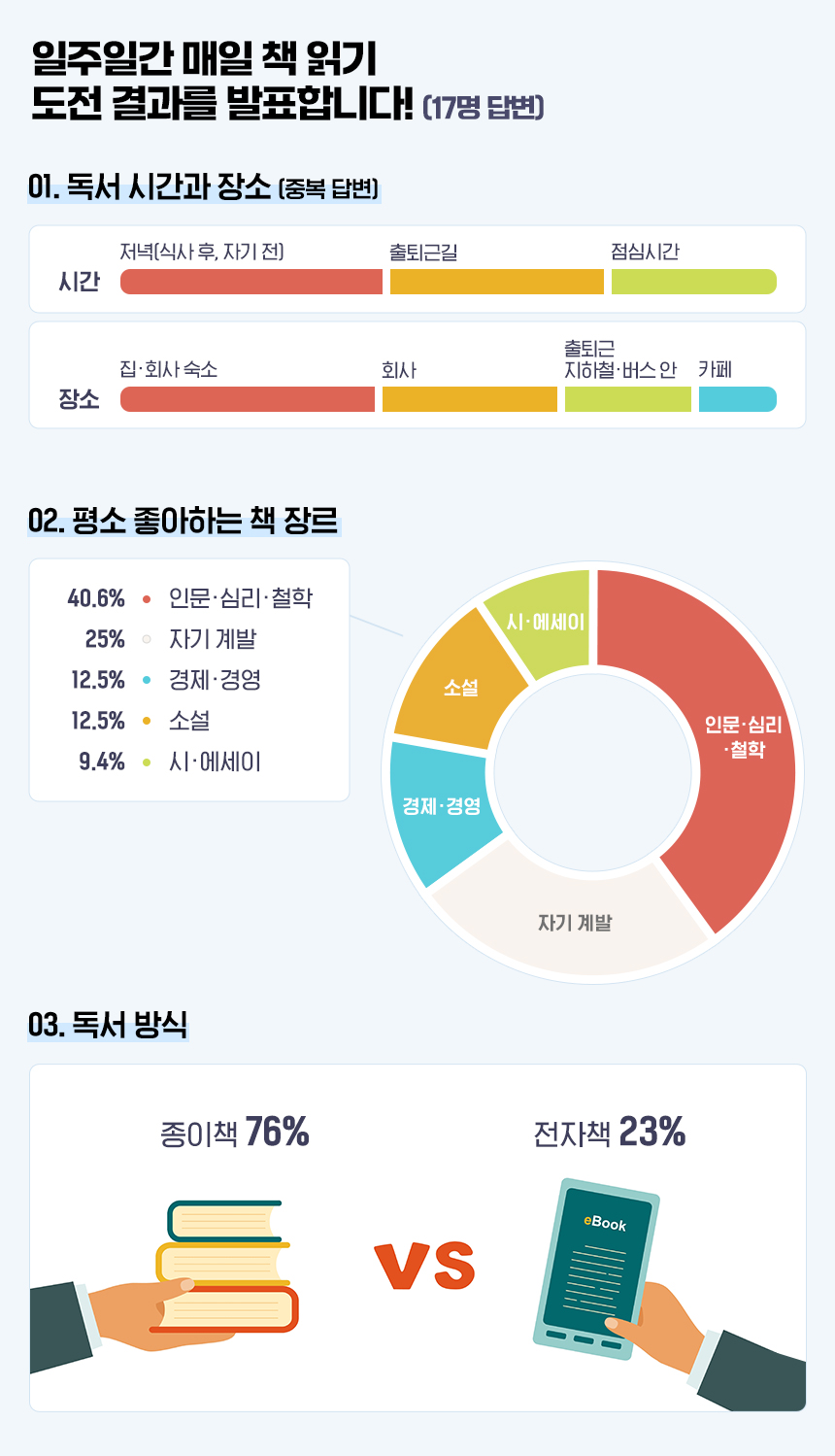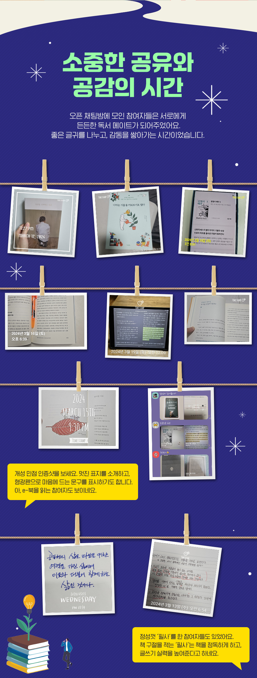 “참여자가 다 같이 읽은 책을 공유하고 인증하는 방식이 조금 낯설었지만, 점차 익숙해지니 같은 목표를 향해 나아간다는 점이 좋았습니다. 독서를 매일 하는 편은 아니었는데, 이번 도전 덕분에 부지런해졌습니다.”