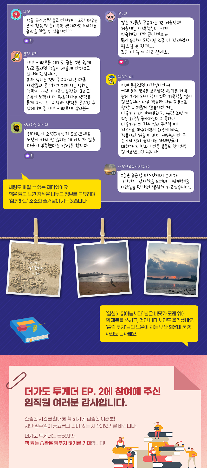 “이번 더가도 투게더를 통해 읽고 싶은 책이 많아졌어요. 참여자분들이 공유해주신 책 중에서 골라 올해 3권 이상 읽어보자고 목표를 정했습니다. 꼭 지켜봐 주세요!”