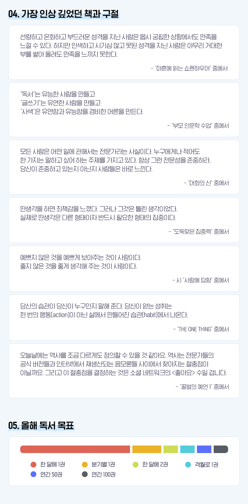 “올해는 자격증 공부를 하느라 독서 시간을 조금 줄였어요. 그런데 좋은 책을 공유해주신 동료분들 덕분에 동기부여가 되어 50권을 목표로 짬짬이 책을 읽어야겠다고 다짐해 봅니다.”