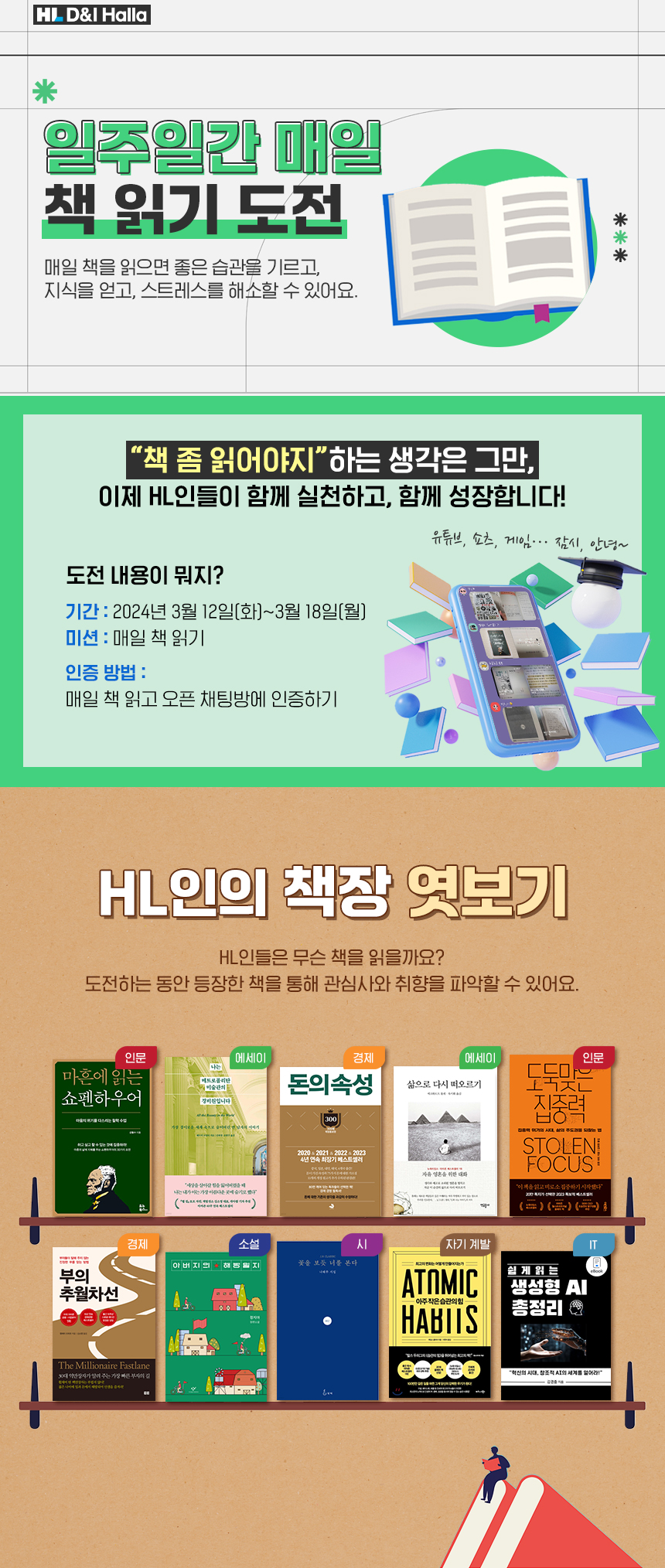 무슨 일이든 꾸준히 실천하는 게 참 어렵습니다. 책 읽기도 그중 하나죠. 꽃피는 3월을 맞이하며 더가도(더 나은 삶을 위한 가치 있는 도전) 투게더 두 번째 공동 도전 목표는 일주일간 매일 책 읽기로 정했습니다. 이번 도전이 책 읽는 습관을 갖는 첫걸음이 되었기를 응원하며, 일주일간의 여정을 소개합니다.