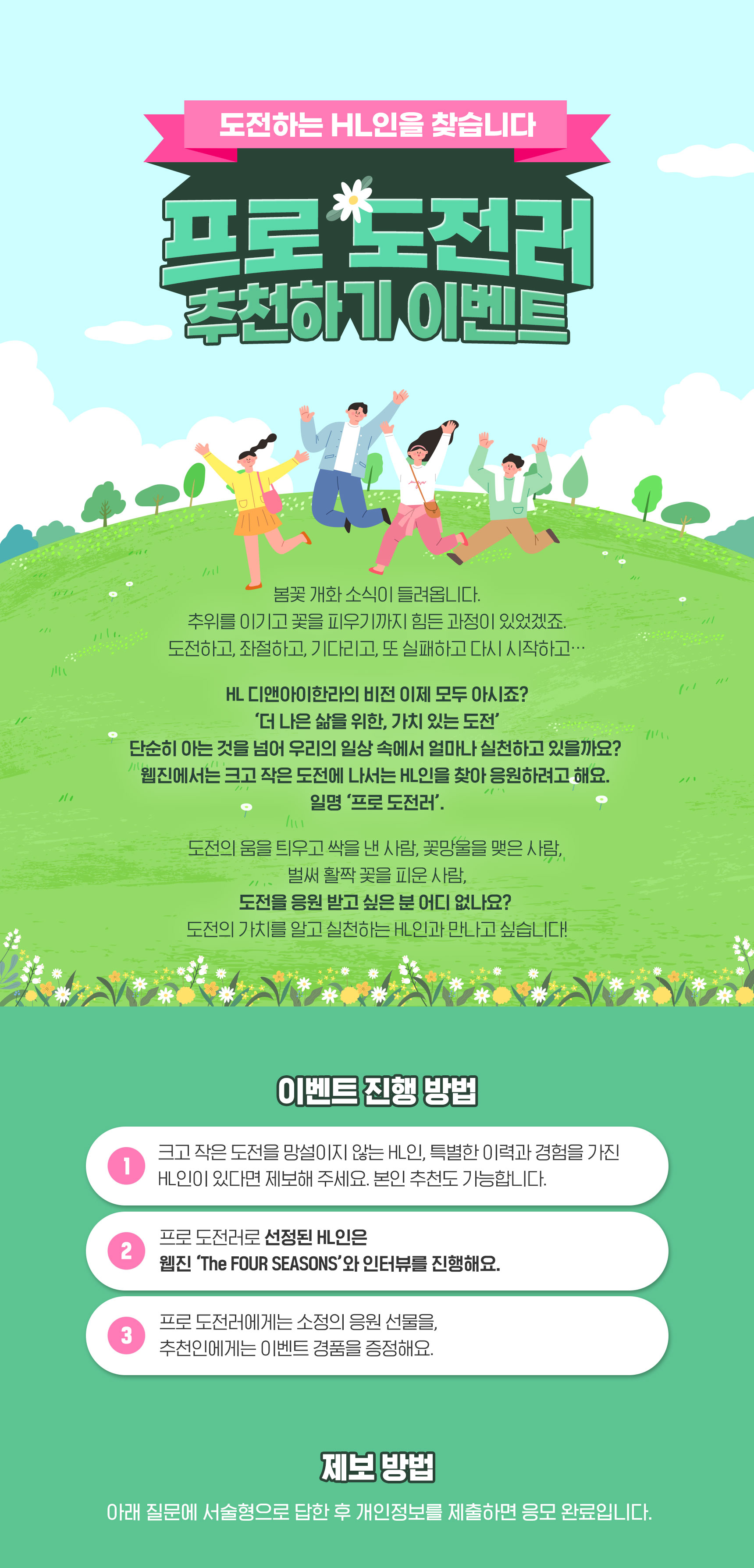 도전하는 HL인을 찾습니다 ‘프로 도전러’ 추천하기 이벤트 Q. 추천하고 싶은 사람의 소속팀과 이름을 알려주세요. (본인 제보 가능) 이전 다음 Q. 추천 이유를 구체적으로 적어주세요. 이전 다음 감사합니다! 틀린 답이 있네요.정답을 모두 맞춰야 이벤트 응모가 가능합니다.다시 한번 풀어보세요. 이름 전자우편 휴대전화 응모하기 개인정보 수집에 동의합니다. 개인정보는 이벤트 당첨자 확인 및 배송 정보 등으로만 사용되며 본 이벤트 외에 다른 용도로 사용되지 않습니다. [이벤트 서비스를 위한 개인정보 수집 및 이용] 서비스 제공을 위하여 이용자의 개인정보를 아래와 같이 수집하고 있습니다. 고객의 정보는 이벤트 서비스에 참여하기 위한 필수정보로서 제공을 원하지 않을 경우 수집하지 않으며, 동의 거부 시 이벤트 참여에 제한을 받을 수 있습니다. 1. 수집 · 이용 목적 - 이벤트 혜택을 제공하기 위한 정보 전달 - 이벤트 혜택 이용에 따른 본인확인, 고지사항 전달 - 접속 빈도 파악 또는 회원의 서비스 이용에 대한 통계 2. 수집 필수 항목 - 이름, 연락처, 이메일 3. 개인정보 보유 및 이용기간 - 이벤트 종료 후 1년까지 (단, 관계 법령에 따라 필요한 경우 해당 법률에서 정한 기간까지) 4. 이용 제한 대상 - 만 14세 미만은 법적 보호자의 동의가 필요합니다. ※ 고객님께서 개인정보의 수집/이용에 동의하지 않을 권리가 있으며, 미동의 시 서비스를 이용하실 수 없습니다. 다시하기 공감0 등록된 댓글이 없습니다. 댓글 등록 Cancel reply 이름은 전체공개되며, 닉네임으로 설정 가능합니다. 이메일은 공개되지 않습니다. 이미지 업로드는 10 MB까지 가능합니다.