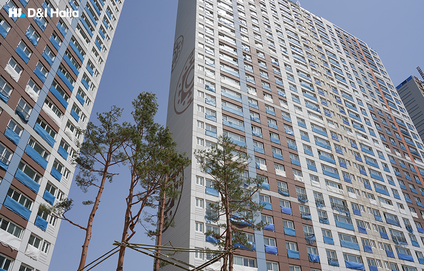 103동 옥상에서는 방수공법을 변경해 적용한 것을 확인했다. 권영철 현장소장은 폴리우레아 방수 시공에 대해 기존 공법 대비 최대 1개월 공기가 단축되는 효과가 있고, 옥상 누수 하자 발생 시에도 발생 부위를 정확히 확인할 수 있어 즉각적인 보수가 가능한 장점이 있다고 설명했다.
