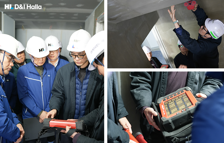 정오부터 참석자들은 1시간여 동안 아파트 내 선행 세대, 계단실, 옥상 등을 둘러보며 상도 코팅 점검, 층간소음 테스트, 폴리우레아 시공, 계단 보강근 점검을 실시했다. 홍석화 수석 사장은 직접 점검표를 들고 현장을 돌아보며 품질 상태를 꼼꼼히 확인했다.