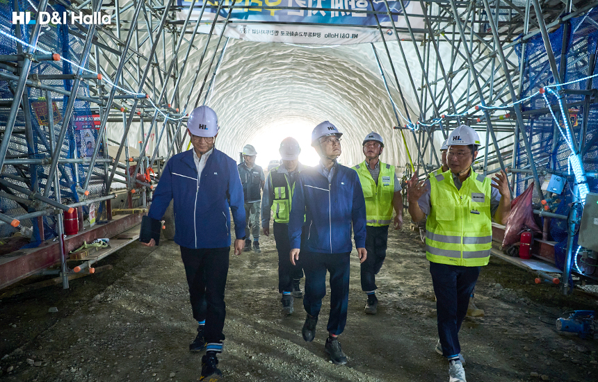홍석화 수석사장과 이범형 현장소장, 공사, 안전, 품질 부문 직원들, 근로자 대표는 주요 작업 구간으로 이동해 현장 점검에 나섰다. 먼저 현장 시점부를 둘러본 다음, 터널 공사 현장으로 이동해 내부를 걸어가며 꼼꼼히 둘러봤다.
