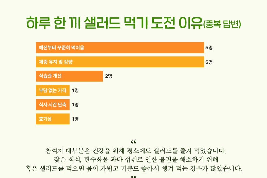 “하루 한 끼 샐러드를 먹어 건강해지는 기분이 들었고, 생각보다 배불러서 앞으로도 하루 한 끼는 샐러드를 먹을 예정이에요.”