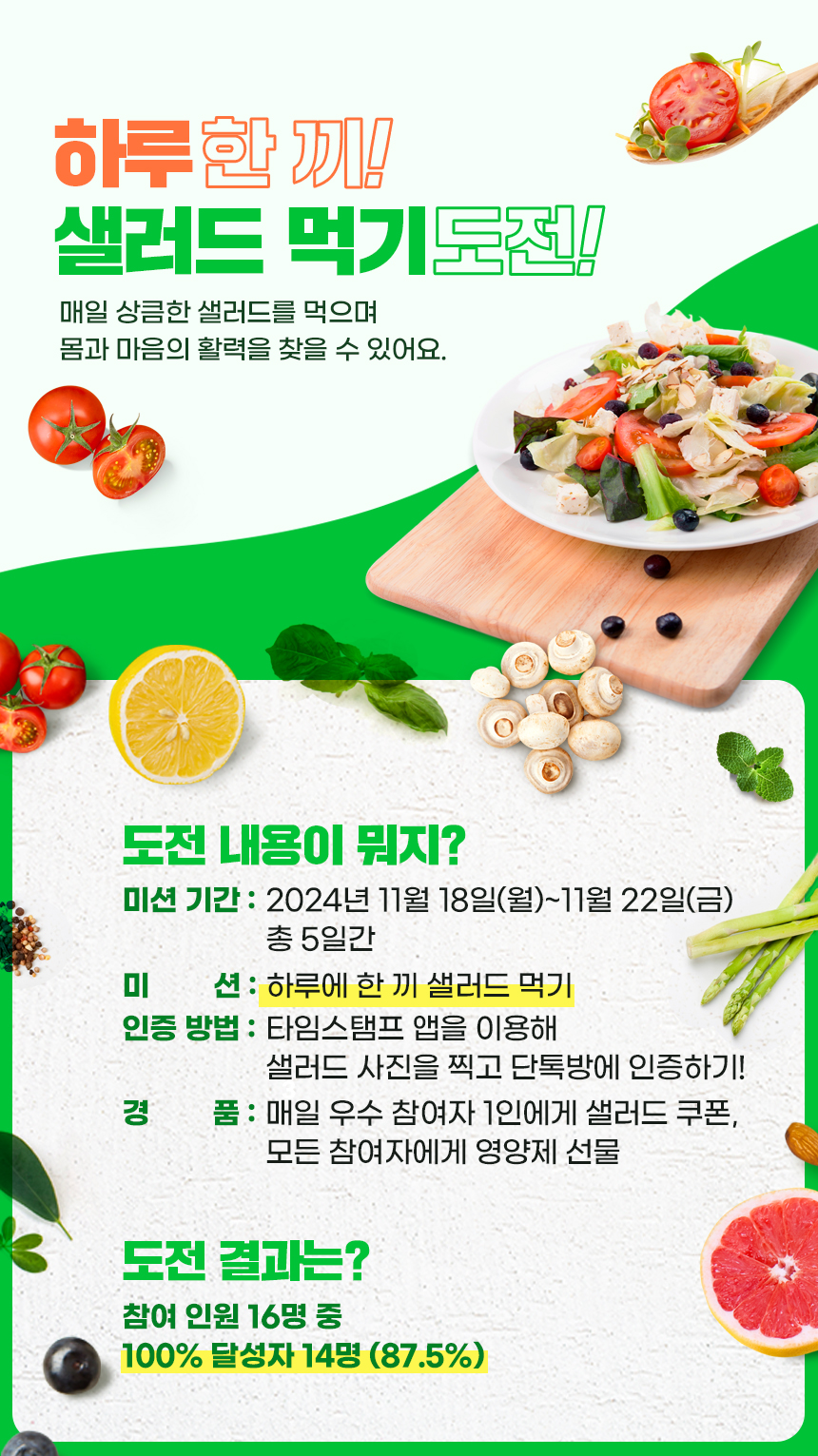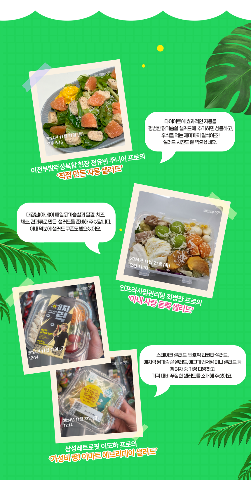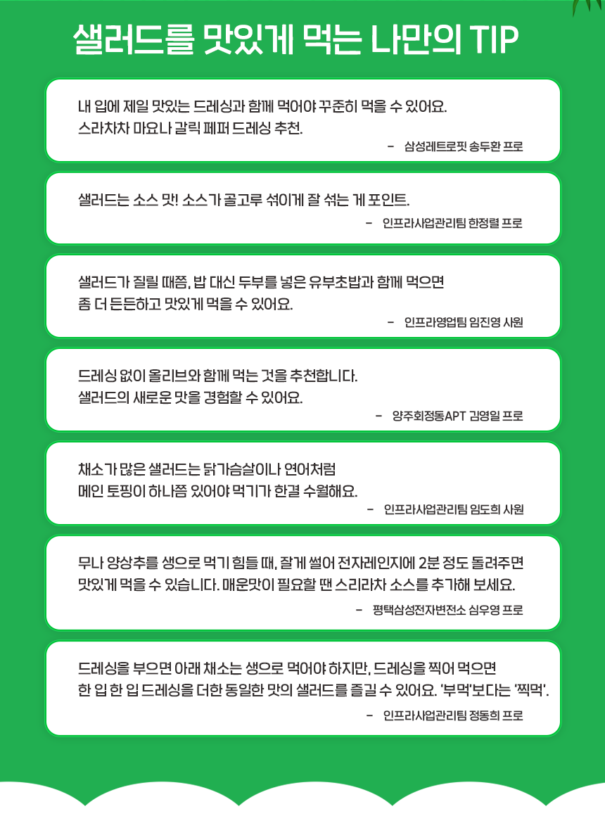 “바쁘신 와중에 샐러드를 잘 챙겨 드시는 분이 많아서 대단하다고 느꼈습니다. 저 또한 건강한 식단에 좀 더 신경 써야겠다고 다짐했습니다. 또한, 챌린지 덕분에 즐거운 점심시간을 보낼 수 있어 즐거웠습니다.”
