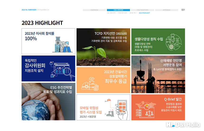 HL 디앤아이한라가 발간한 지속가능경영보고서’가 2023~2024 LACP 비전 어워드에서 2년 연속 최고 등급인 대상(Platinum)을 받는 쾌거를 거뒀다. 국내 사기업 중 유일한 수상으로, 글로벌 수준의 지속가능경영 및 ESG 정보 공개 역량을 다시 한번 인정받았다.
