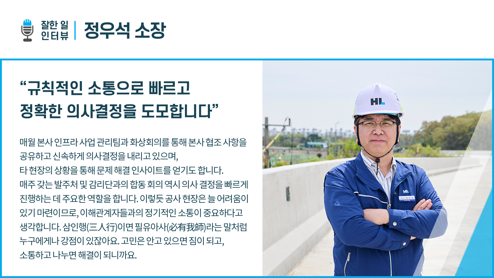 HL 디앤아이한라의 토목 역량을 증명하는 ‘원당~태리 간 광역도로 건설 공사’ 현장. 공사 지연의 난관을 극복하고, 프로젝트 성공을 위해 순항 중이다. 현장팀과 본사, 협력업체, 발주처의 긴밀한 소통의 힘이 발휘되고 있는 현장을 찾아가 보았다.