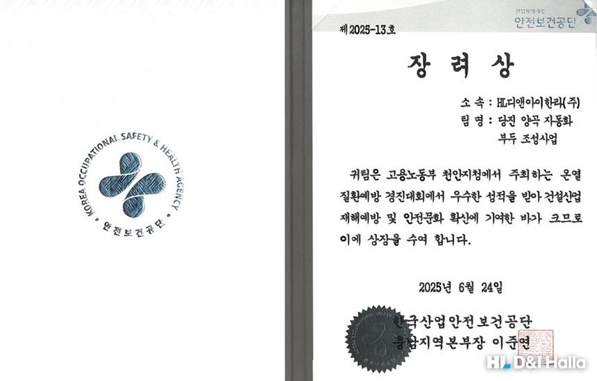 처음 공적조서를 작성할 때는 기대감 없이 시작하게 되었습니다. 점차 욕심이 생겼고, 이는 단순한 개인 포상 차원을 넘어 회사 이미지를 높이고, 소속된 안전보건팀의 노고를 대외적으로 알릴 좋은 기회라는 생각에 적극적으로 도전하게 되었습니다. 큰 상을 받게 되어 기쁘고, 시상식 화면에 제 이름과 함께 ‘HL 디앤아이한라’라고 회사명이 뜨는 것을 보며 뿌듯함과 감격스러움을 느꼈습니다.
