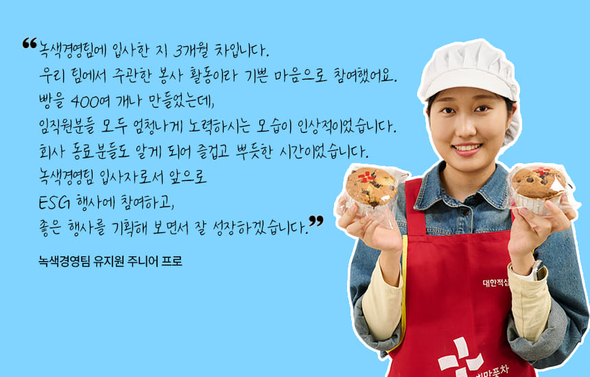 맛있게 구워진 빵 냄새로 조리실이 가득해졌습니다. 임직원들은 오븐에서 갓 나온 빵이 식기를 기다리며 뿌듯한 듯 웃음을 보였는데요. 곧 포장 작업이 이어졌고, 장장 3시간 동안 총 400여 개의 빵을 완성할 수 있었습니다. 휴식 시간도 없는 고된 과정이었지만, 아이들이 이 빵을 맛있게 먹어주기를 바라는 마음으로 임직원들은 마지막까지 정성을 듬뿍 담았습니다.