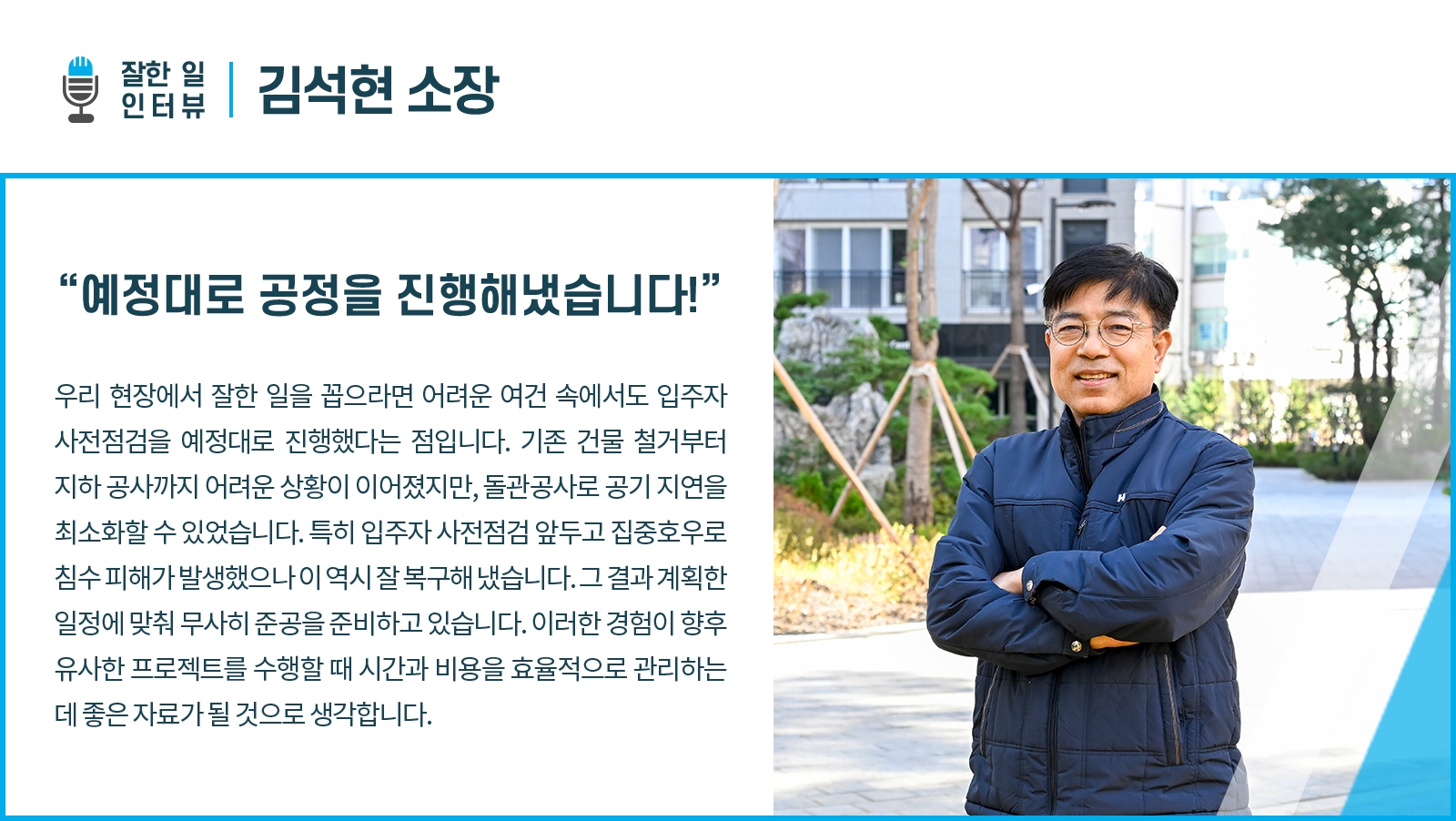 “그때 직원들이 하루도 쉬지 않고 현장을 지켰습니다. 현장 구성원 모두가 서로를 믿고, 그 믿음 속에서 최선을 다할 때 안전과 품질, 공기 모두 지킬 수 있는 것입니다. 진정한 팀워크가 빛난 순간이었습니다.”
