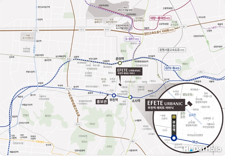 광역 교통망도 눈길을 끈다. 1호선 부천역과 소사역, 7호선 춘의역을 도보로 이용할 수 있는 입지로 서울 주요 업무지구 접근성이 뛰어나다. 서울 시청까지 약 30분대, 강남까지 약 40분대로 이동할 수 있으며, 경인로와 수도권 제1순환고속도로를 이용하면 여의도와 광명 등 주요 지역으로의 이동도 수월하다. 여기에 향후 부천종합운동장역에 GTX-B 노선이 개통되면 여의도까지 약 8분대로 이동이 가능해져 교통 편의성은 한층 더 높아질 전망이다.