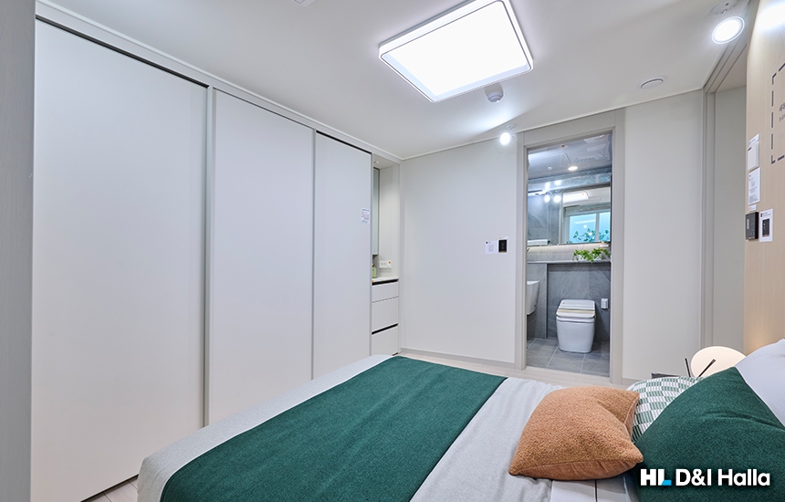 64㎡ A형 세대의 ㄱ자형 주방과 침실, 욕실